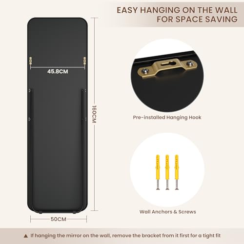Easy & Flexible Use: Ready to use right out of the box—no assembly required. This full body mirror comes with a pre-fitted bracket and full fixing kit, offering three versatile setups: use it as a freestanding mirror with the bracket open, lean it safely against the wall with the bracket folded, or mount it securely by removing the bracket