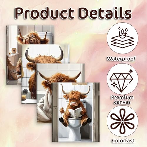 Unique Design: Add a touch of playful personality to your bathroom or bedroom with this set of four beautiful highland cow bathroom wall paintings. Each design has a playful yet rustic feel, perfect for lifting the mood and adding a smile to your space